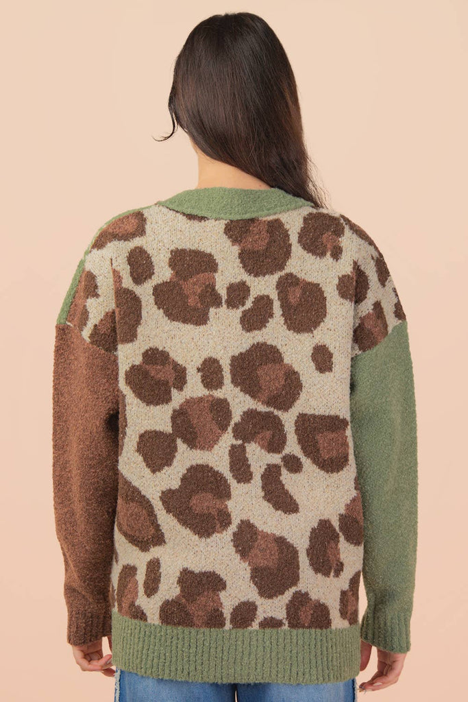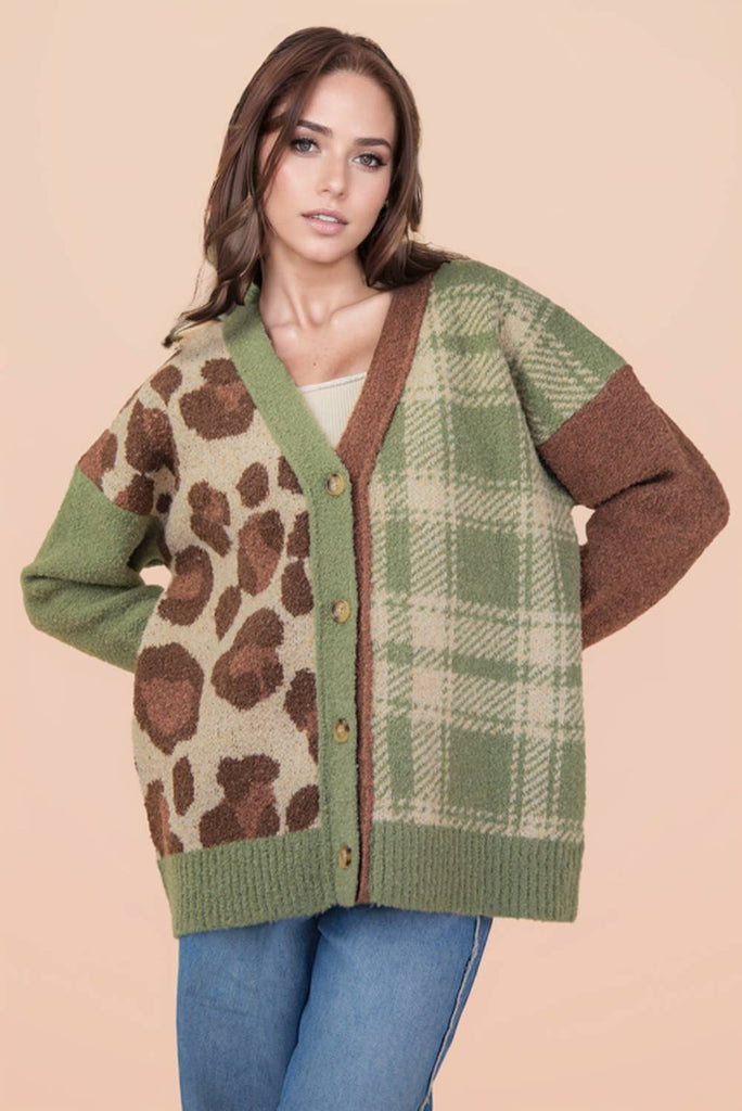 Leopard & Plaid Graphic Knit Sweater Cardigan