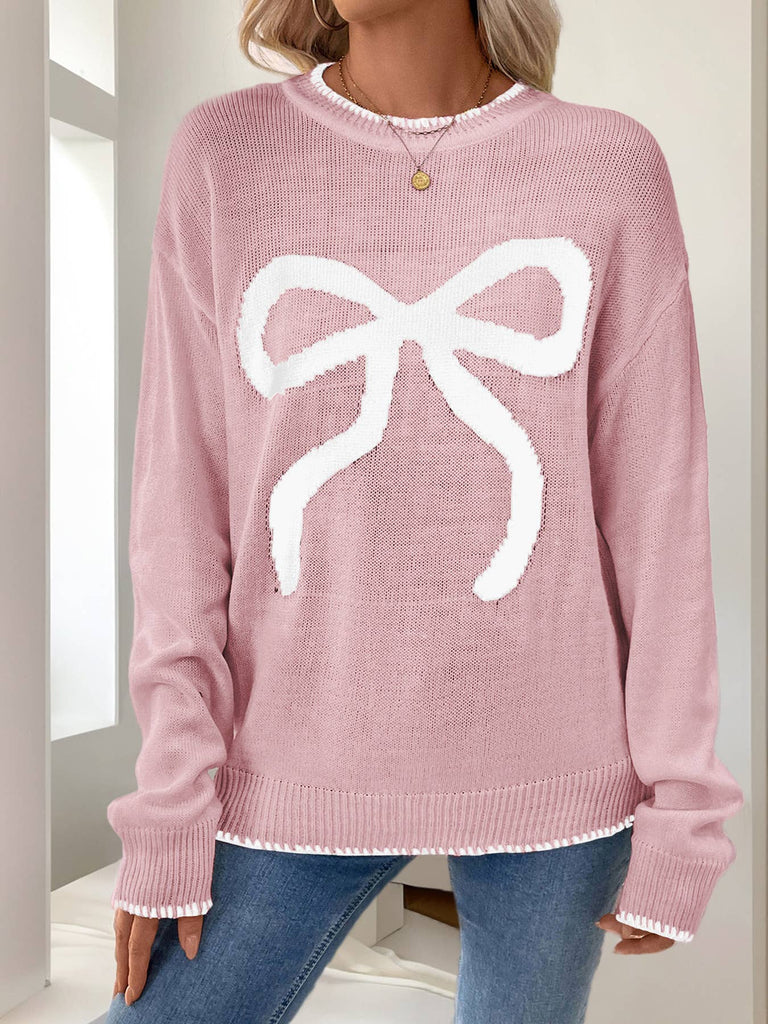 This playful long sleeve crew neck sweater features a soft, ribbed knit design that promises cozy comfort. An oversized bow at the front adds a charming touch, while unique neckline and cuff details bring delightful style to your everyday look. The snug ribbed hem keeps you warm and snug, making this sweater a fun and fashionable choice for cool days.
