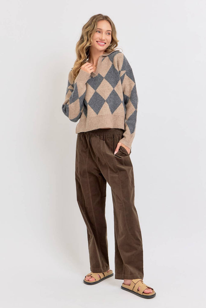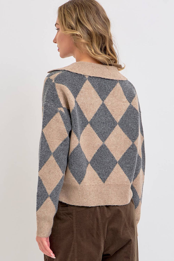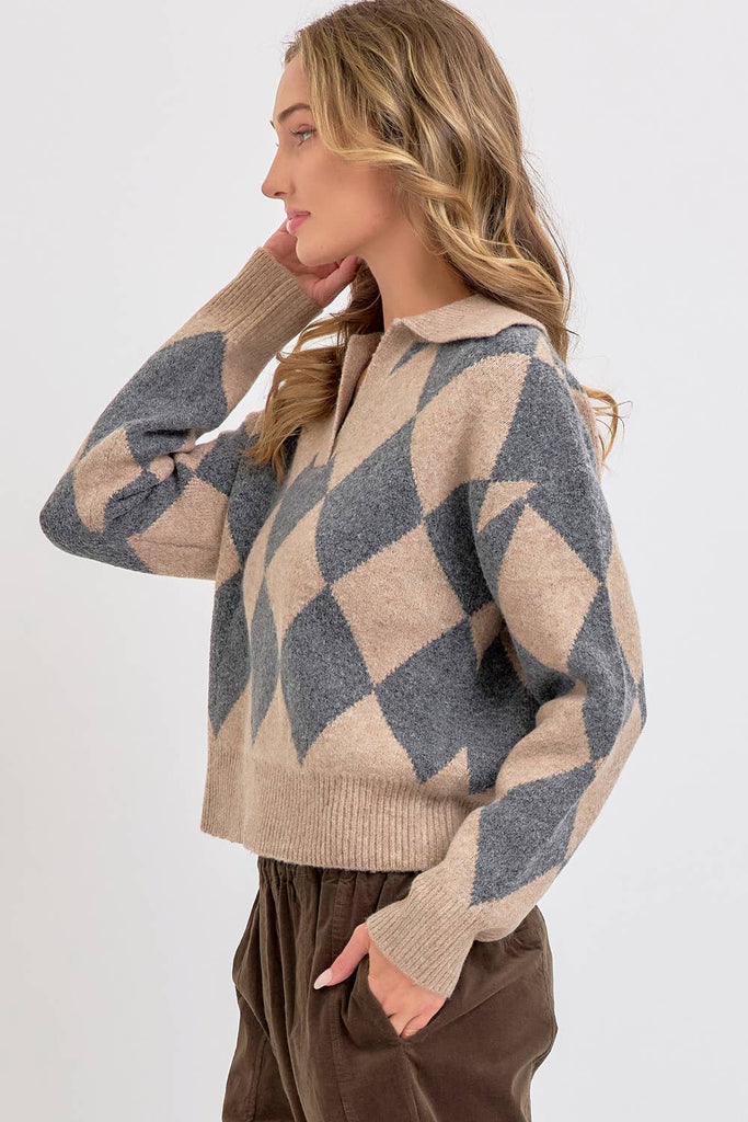 Elevate your everyday wardrobe with this diamond pattern knit sweater that's as comfy as it is chic. Crafted from soft stretch knit fabric, it features a relaxed fit and collared neckline that works beautifully on its own or layered under your favorite jacket. The long sleeves and gentle stretch keep you moving freely all day long, making it the go-to piece for casual vibes and effortless style. A timeless essential that proves comfort never goes out of fashion.