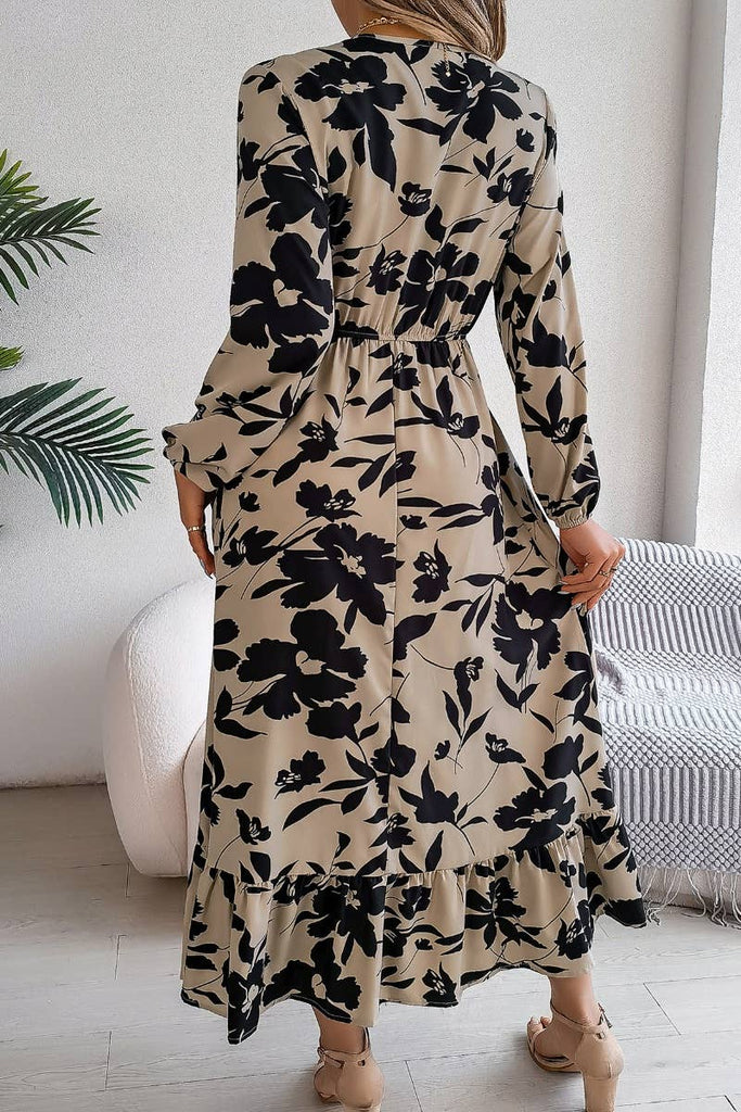 Embrace the season in this charming V-neck floral dress that effortlessly blends comfort with style. Featuring muted blooms in soft beige and classic black, it's the perfect piece for casual autumn days when you want to look put-together without trying too hard. The long sleeves keep you cozy while the relaxed fit lets you move freely. Whether you're running errands or meeting friends for coffee, this dress proves that florals aren't just for spring—they're your new fall favorite.