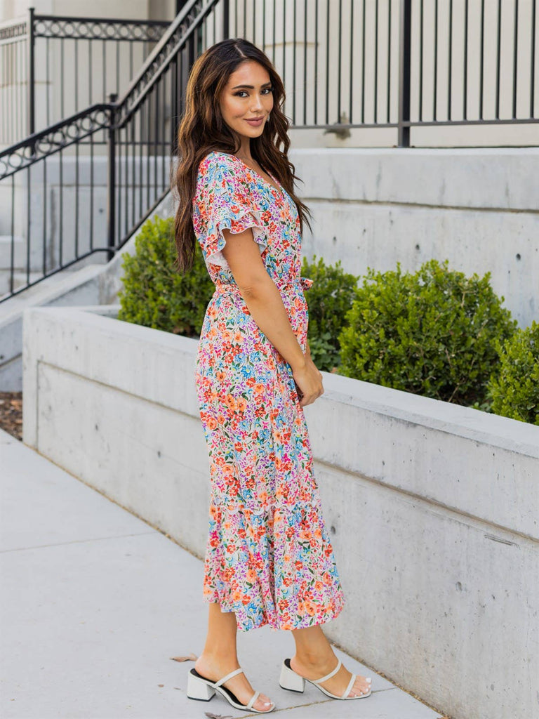 With its vibrant and playful floral print, this dress will turn heads wherever you go. The tie waist and flutter sleeves help accentuate your curves and add an extra touch of femininity. The midi length makes it perfect for all occasions, from brunch with friends to a beautiful summer wedding. What sets the Floral Monroe Dress apart is its versatility. The removable tie at the waist allows you to adjust the fit to your liking and create a personalized look. Whether you prefer a fitted or relaxed silhouette, this dress will have you looking your best!