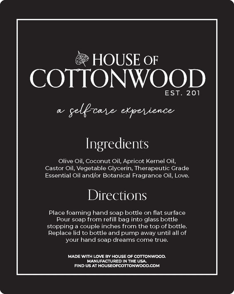 Introducing our famous, naturally derived hand soap refills, made with 100% liquid soap and therapeutic grade essential oils. Our Foaming Hand Soap is renowned for its ability to leave your hands feeling silky smooth while providing a personal aromatherapy experience. Unlike other hand soaps, our formula contains no detergents, synthetic colors, or fragrances, ensuring that your skin's natural oils are not stripped away and your endocrine system remains undisturbed.