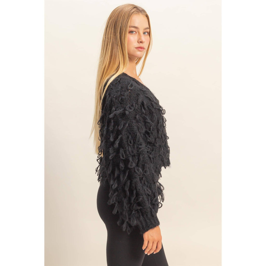 We can't get enough of this sweet sweater cardigan! Striking the perfect balance between trendy and chic, it comes with a V-neck, balloon sleeves, and a button-front bodice. Fringe accents throughout add up to the style appeal for an eye-catching look.
