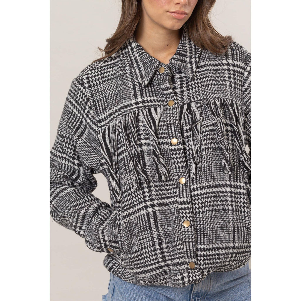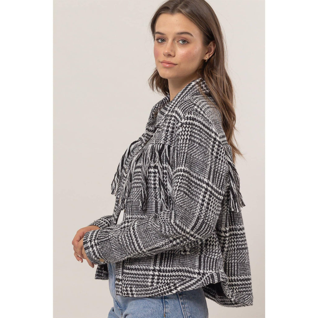 Elevate your everyday style with this show-stopping plaid jacket that's anything but ordinary. Featuring an all-over glen plaid pattern, this button-down beauty boasts a classic collar, relaxed drop shoulders, and long sleeves for effortless sophistication. But here's where it gets fun—the fringe trim adds just the right amount of modern flair to keep your outfit feeling fresh and unexpected. Perfect for those days when you want to look put-together without trying too hard.