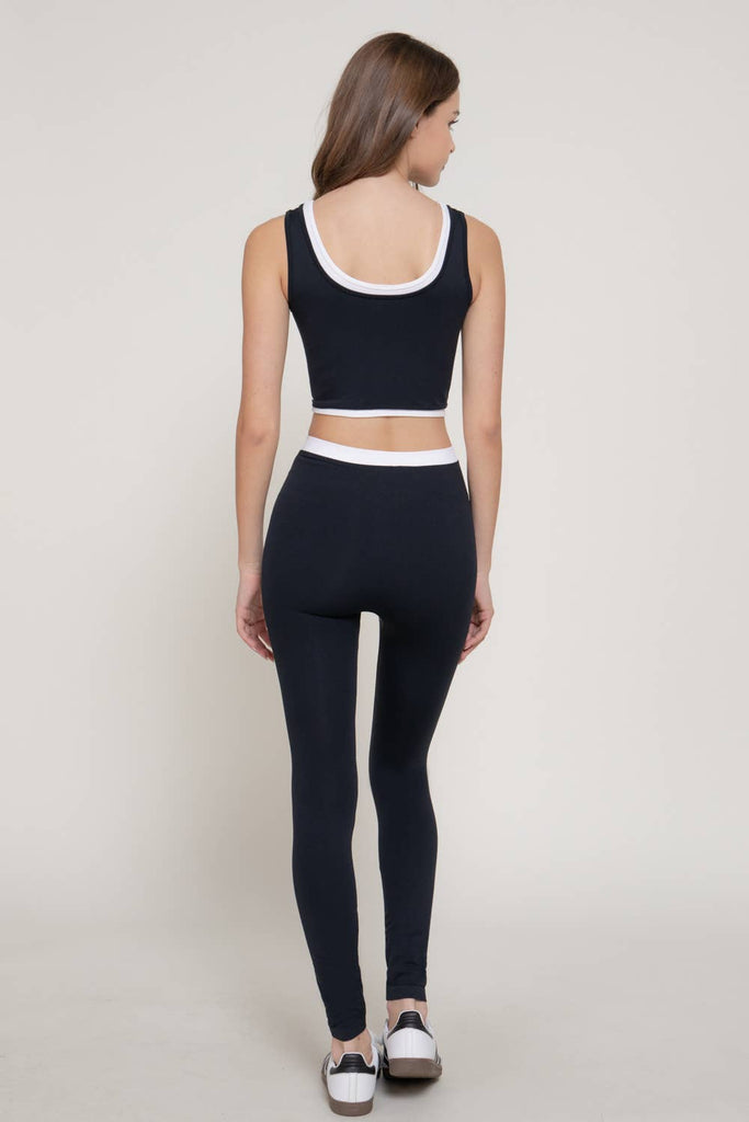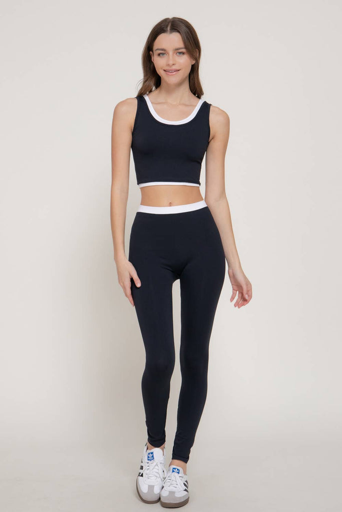 This two-piece set combines a stylish round neck crop top with a flattering double-layer design and high-waist leggings featuring a contrast waistband. The seamless construction in premium nylon-spandex blend offers stretch, comfort, and a smooth silhouette perfect for workouts or everyday wear. The high-waist design provides support and coverage while the crop top's layered effect adds visual interest and dimension to your activewear collection.