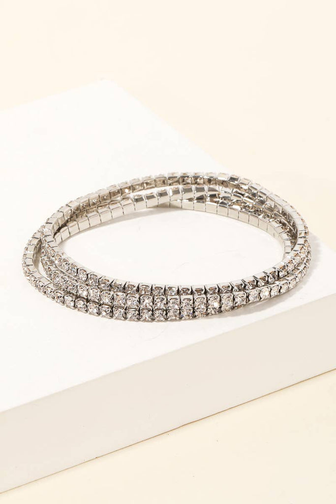 A modern classic, this stretch bracelet showcases an alluring three row rhinestone studded stretch bracelet design. The perfect way to elevate any outfit, this accessory adds a touch of elegance and style.