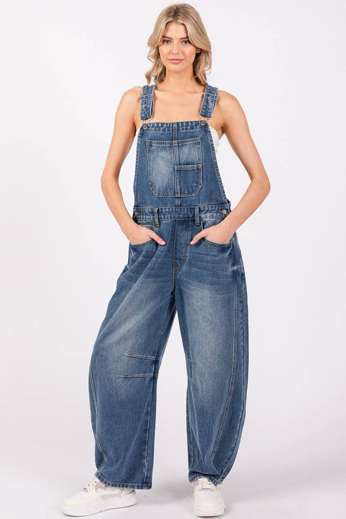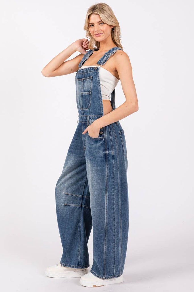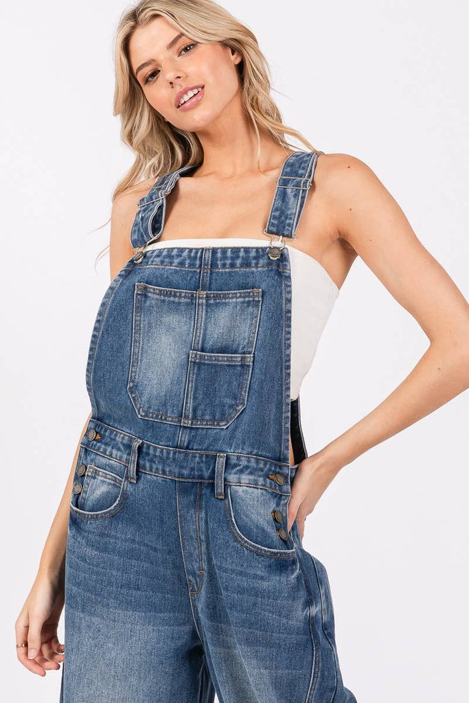 Washed Denim Overall featuring a classic Bib-and-Brace design. These overalls showcase a modern, tapered leg. The cotton washed denim fabric offers both comfort and a vintage-inspired look. Functional and stylish, this piece includes adjustable shoulder straps, practical pockets, and a side button closure for easy wear. Perfect for layering over your favorite tops, these overalls are a versatile addition to your wardrobe, ideal for casual outings or laid-back weekends.