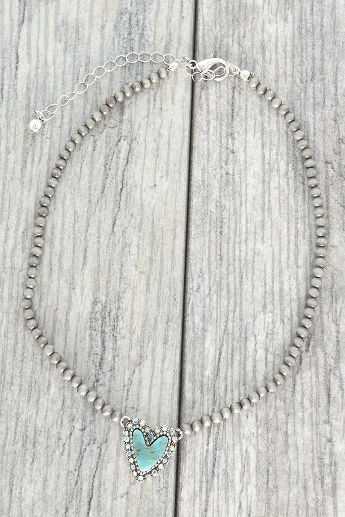 Discover the beauty of the Western Navajo Turquoise Heart Charm Necklace. Handcrafted with genuine turquoise, this necklace adds a touch of elegance to any outfit. The heart-shaped charm symbolizes love and brings positive energy. Complete your look with this stunning accessory.